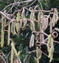 Korkenzieherhaselnuß 2-4m, Blatt gerollt, Blüte: gelbgrüne Kätzchen, III-IV, korkenzieherartig gedrehte Triebe, Wildtriebe sofort entfernen, Solitärpflanze.