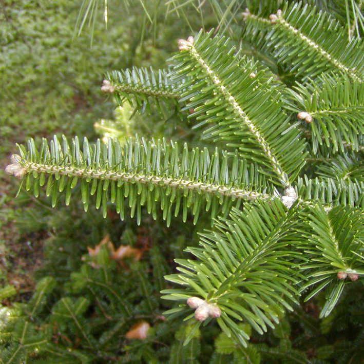 Tannen. Als junger Baum breit-konisch geformt, kann sie höher als 30 m werden. Die bis 3,5 cm langen, dichtgedrängten Nadeln sind dunkelgrün und haben blau-weisse Streifen auf der Unterseite sowie stumpfe Spitzen. Die graue Rinde an den jungen Bäumen und die unreifen Tannenzapfen sind purpurn getönt. Die Zwergzüchtung `Prostrata' hat keinen Hauptspross.