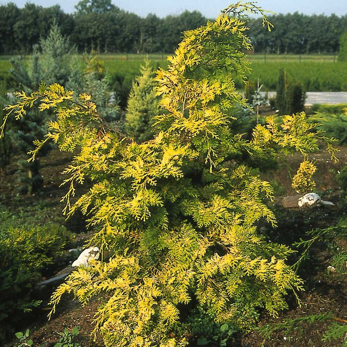 Breit ausladende, pyramidal wachsende Konifere. Höhe 4-5 m, Breite ca. 3 m. Offener Wuchs mit ausladenden Ästen. Laub tief goldgelb. Heller, vorzugsweise geschützter Standort. Humusreiche Böden. Dekorative Einzelpflanze.