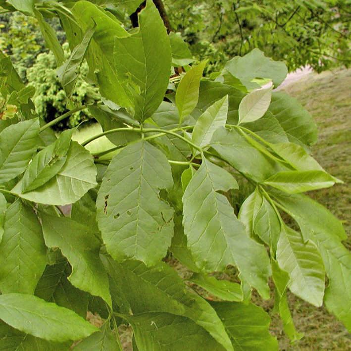 Sommergrün, gegenständig, unpaarig gefiedert, 8 bis 14 cm lang, kerbig gesägt, Blättchen meist zu 7, eiförmig bis länglich, 3 bis 7 cm lang, sattgrün, unterseits hellgraugrün, Mittelrippe an der Basis rostrotbraun behaart, Herbstfärbung sehr schön gelb bis gelbviolett und später braunviolett.