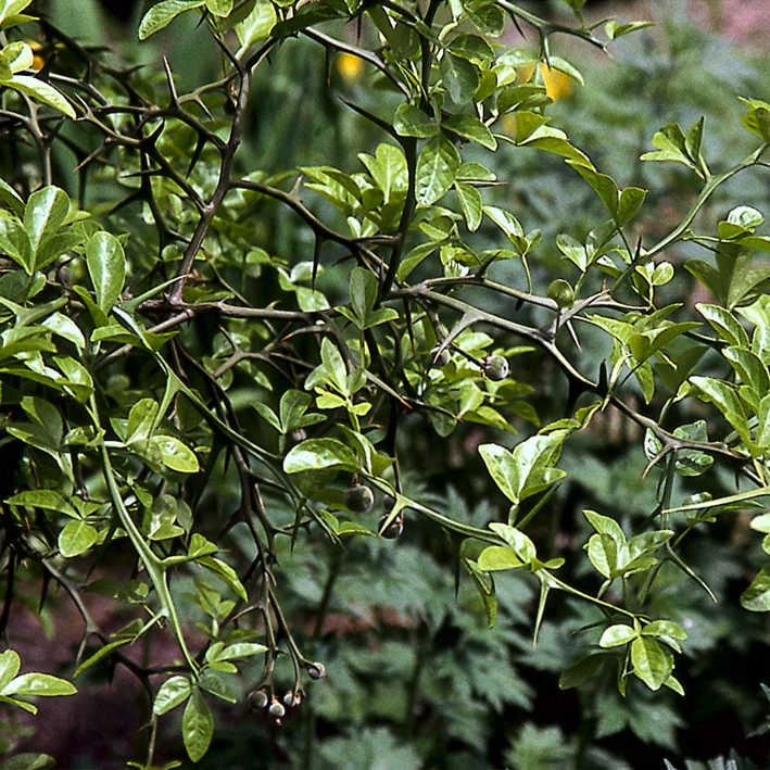 Strauch mit auffallend grünen, bedornten Zweigen, bis ca. 2 m hoch. Filigranes, glänzend dunkelgrünes Laub. Weisse, duftende Blüten im Juni bis August. Im Herbst grün-orange Früchte. Sonniger, gesc...