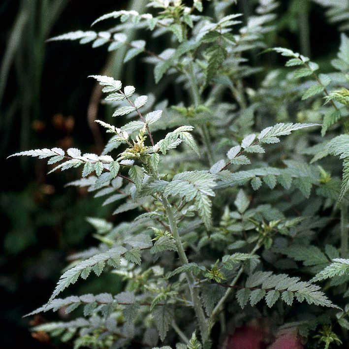Rubus thibetanus 'Silver Fern' Grosser, aufrecht wachsender, sommergrüner Strauch, bis ca. 2 m hoch. Auffallend silbrig-graue Zweige. Geschlitztes, silbrig grau-grünes Laub. Violett-lila Blüte im J...