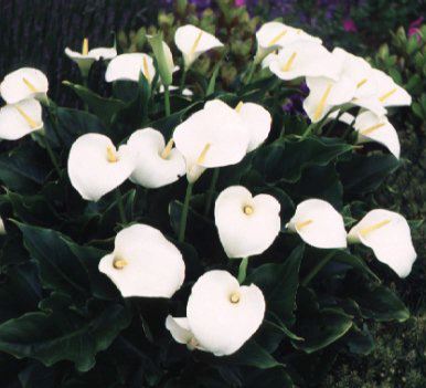 Die berühmte Gattung aus der Familie der Aronstabgewächse. Knollenstaudenarten aus Süd- und Ostafrika. Der Blütenstand besteht aus einer trichterförmigen, weissen, gelben oder rosa Spatha und einem zentralen, fingerähnlichen, gelben Blütenkolben (Spadix). Die Blätter sind glänzendgrün und vorwiegend pfeilförmig.