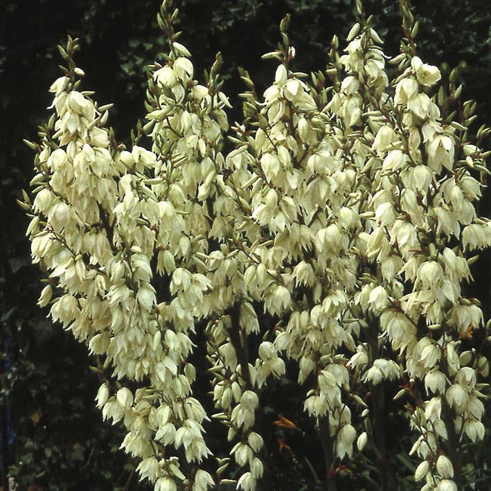 Dekorative, immergrüne Einzelpflanze mit schwertförmigem Blatt. Bildet grosse, gut 1 m hoch werdende Büschel. Perlweisse Blüten an hohen, bis gut 1,5 m hoch werdenden Blütenstielen. Juli-August. Kalkliebend. Geschützter Standort.