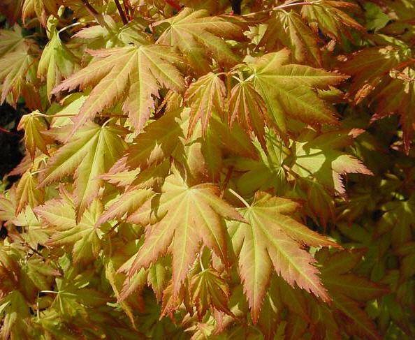 Aufrecht wachsender Fächerahorn mit locker überhängenden Zweigen, etwa 1,8 m hoch werdend.Blätter im Austrieb goldorangefarben, s
