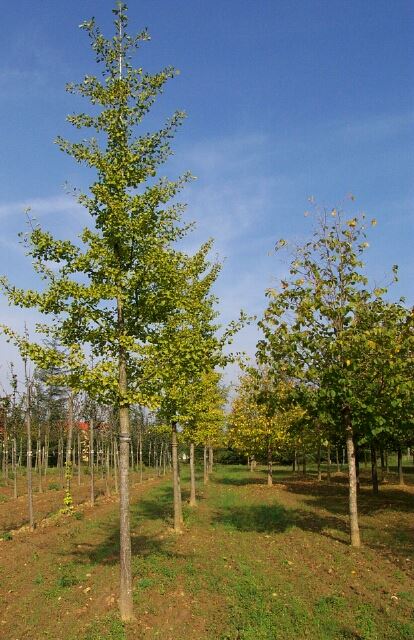 Ginkgo, 15-20m, Nadel: sommergrün, fächerförmig, gelbe Herbstfärbung, frische durchlässige Böden, anpassungsfähig, zweihäusig, Solitärbaum.