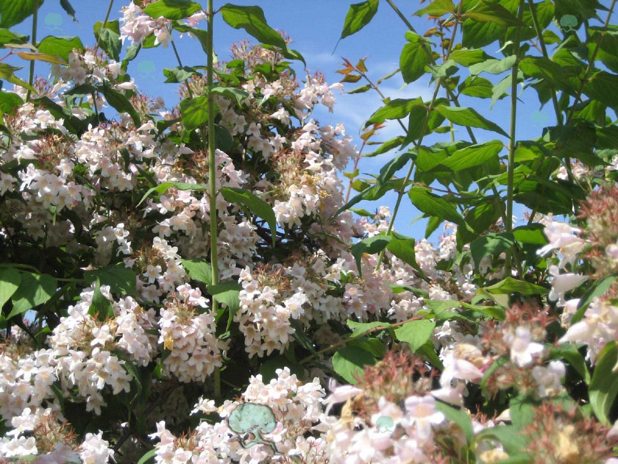 Beschreibung: Laubabwerfender, breitwüchsiger Strauch mit hängenden Ästen. Die Rinde schält sich bei älteren Ästen ab.( Keine Krankheit) Die Blätter sind hellgrün und stehen paarig am neuen Trieb. Er wird bis zu 3m breit und auch über 2m hoch. Im Mai/Juni öffnen sich eine Vielzahl von Glockenblüten die sich am Triebende gebildet haben. Die Bluten sind weiss oder rosa und haben einen gelben Schlund. Eine schöne Hybride dieser Art ist " Pink Cloud" die auf dem Bildern gezeigt ist. Pflege: Diese Pflanze gedeiht gut in einem fruchtbaren durchlässigen Boden. Sie liebt die volle Sonne. Der Strauch ist absolut winterhart. Alte Äste und schwache Triebe nach der Blüte entfernen.