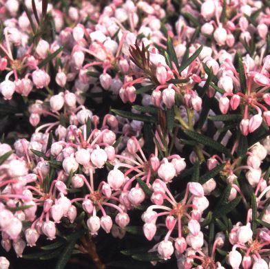 immergrüner und stark verzweigter Strauch. Höhe ca. 4 cm. Breite bis 6 cm. Blatt ist lederartig, länglich und glänzend grün. Kleine, hellrosa Blüten in Trauben. Mai - Juni. Geeignet für einen nicht...