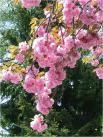 Japanische Blütenkirsche Rinde rotbraun, später braungrau, rissig, Laub spitzelliptisch, bis 10 cm, im Austrieb braunrot, später glänzend grün, Blüte dunkelrosa, dicht gefüllt