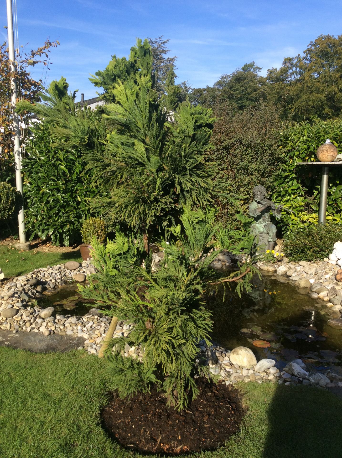 Schmal pyramidal wachsende Konifere. Höhe4-6 m, Breite bis 2,5 m. Lockerer, offener Wuchs. Laub frischgrün. Zweige an den Triebenden Hahnenkamm ähnlich ausgebildet. Humusreiche, vorzugsweise leicht...